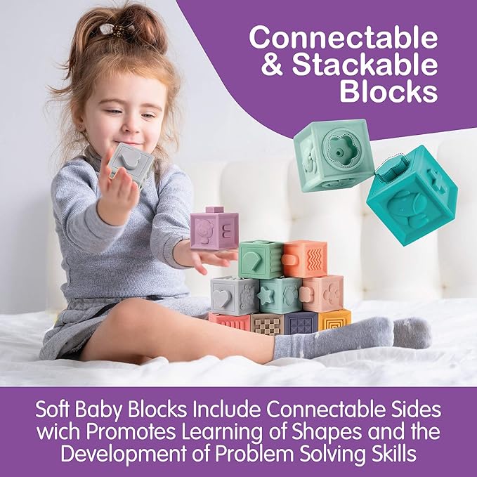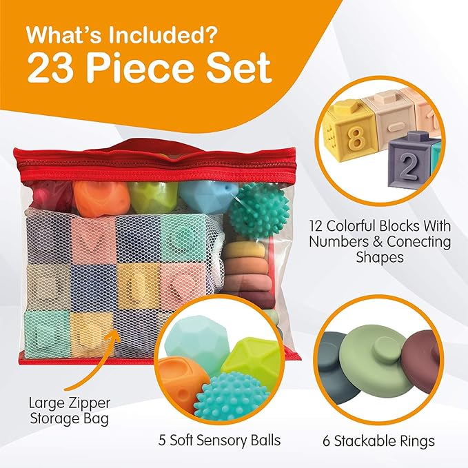👶🏻 WHAT YOU GET - Dive into a 3-in-1 baby toy extravaganza! Our set includes 22 pieces, featuring 12 vibrant blocks, 6 soft stacking rings, and 4 squishy sensory balls. It's the ultimate bundle for endless hours of fun!